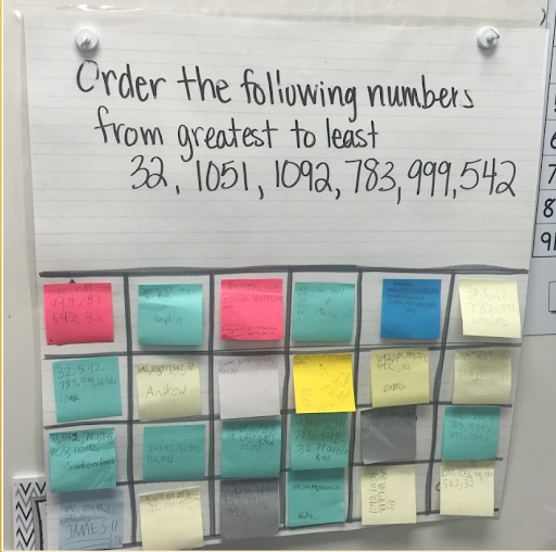 formative assessments. The data you collect will be the guide for your lessons and small group instruction. When it comes to assessments, it does not need to be a formative assessment. Make it quick and easy so that you can group and adjust your lesson plans. I personally love using a note card check or a piece of poster board laminated with my students numbers exampled in the picture. I would write a question that I wanted the students to either answer before or after the lesson I taught. The students would write their name on the back of sticky note and the answer on the other side. Then I’d have them take the sticky note up to the poster and place it on their class number. Once the lesson was over, or the students were performing the activity I could quickly go over and pull the sticky notes and group them into categories. Got it, Almost got it, and Did not get it. Again divide and conquer!
